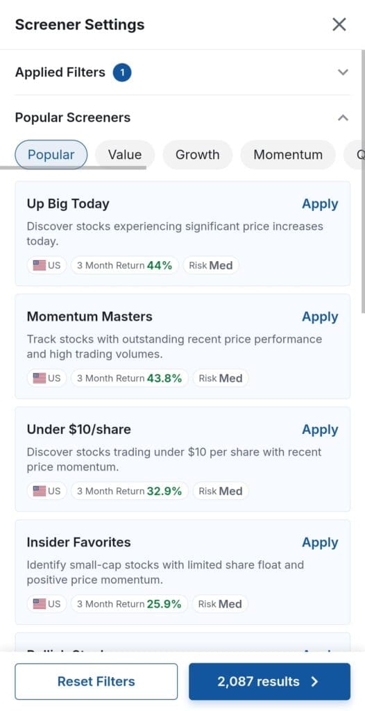 InvestingPro’s advanced stock screener stands out for its comprehensive filtering options, including over 1,000 metrics such as revenue growth, profitability indicators, and valuation measures.